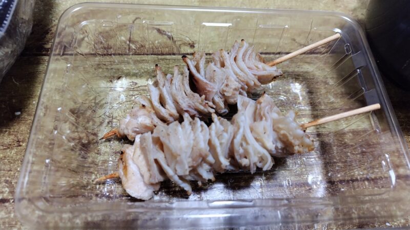 ”やきとり”屋さんですが、豚の串焼きもカシラ・バラ肉など数種類あります。今回は、その中から”豚ナンコツ”を2本購入。