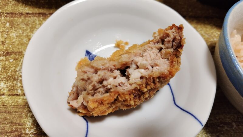 敢えて、温め&ソースなしで食べてみましたが、お肉が粗挽きでしっかり粒子感を感じることができます。