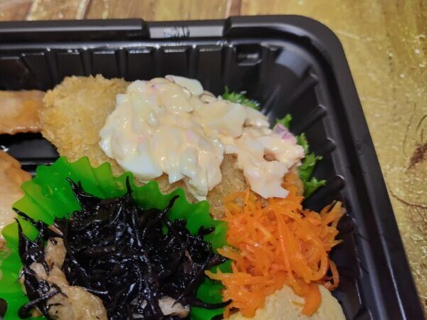 お弁当の定番サラダと言えば、ポテトサラダだと思いますが、代わりに人参サラダが添えられていて、こちらも華やかな気分になりますね。