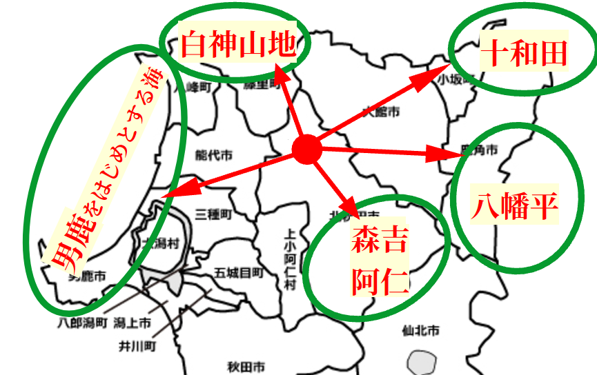 - 鷹巣エリアは、白神山地・男鹿・十和田・八幡平・・・様々なアウトドアエリアの真ん中に位置していること