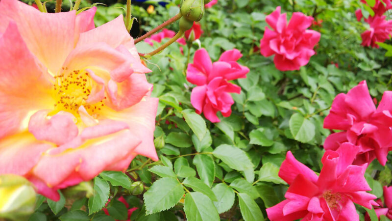 入り口からまっすぐ進んだ突き当りに、紫・黄色・赤ピンクと3色のバラが壁を作るかのように植えられているスポットがあります。ここを背に記念撮影も良さそうです。実際に近くの保育園の子達が散歩に来て、先生が写真を撮影されていました。