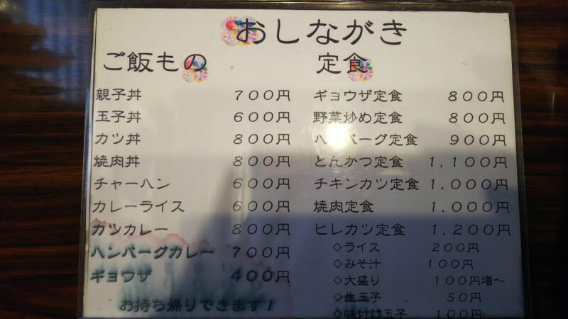 メニューは、ご飯もの(丼物)、定食、ラーメン・うどん・焼きそばと言った麺類という構成ですが、割と豚カツの比率が少ないことに気付きます。或る意味、お店の表に書いてあった色々やってる雰囲気通りではありますね。