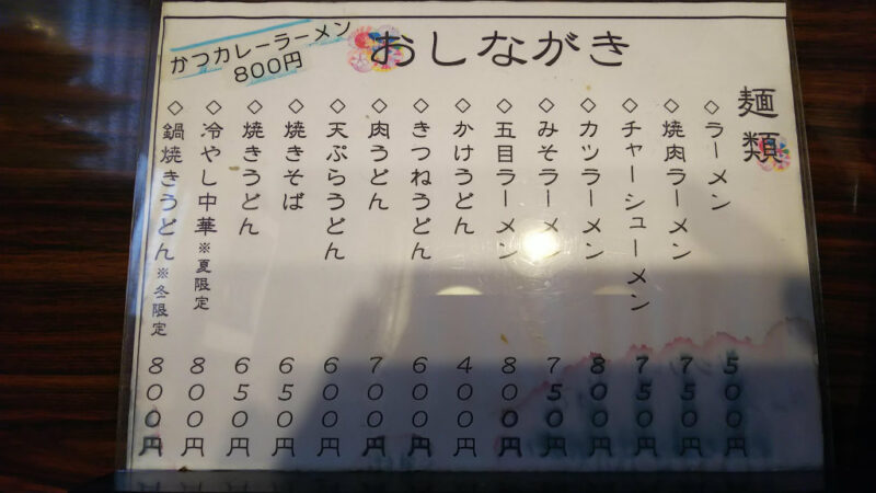 ちなみに、注文してから気付いたのですが、同じ値段でカツカレーラーメンも提供されています。後ろの席の方たちが注文されていたので、コッソリ覗いてみようと思ったのですが、残念ながらお目に掛かることができませんでした…。同じ値段で提供して儲けはあるのかな…?