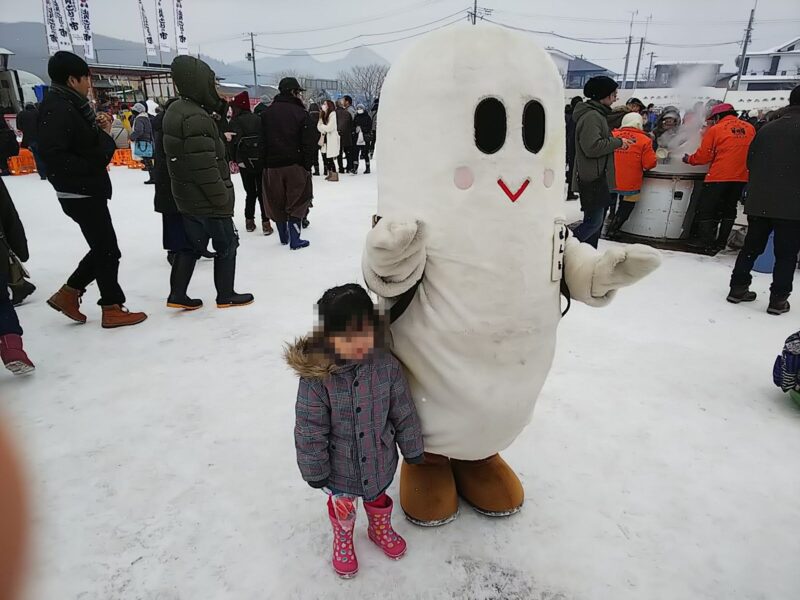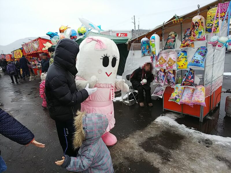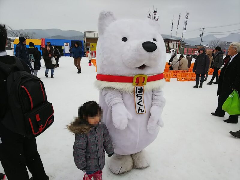 大館市ではおなじみのキャラクターが常に歩いています。子供たちが集まってくるので、写真撮影も一苦労でした。